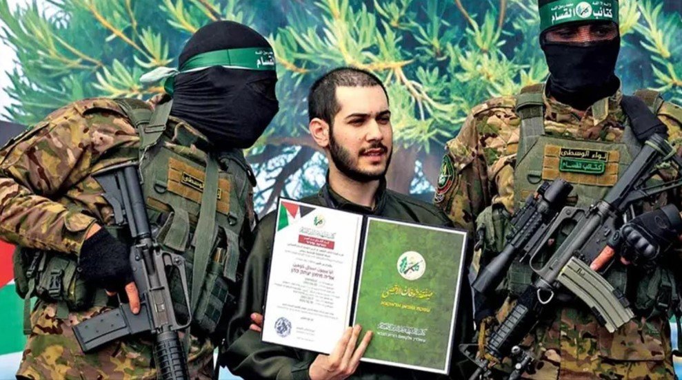 Durante la entrega de rehenes, miembros armados de Hamás los presentaron en una tarima antes de ser trasladados por la Cruz Roja.