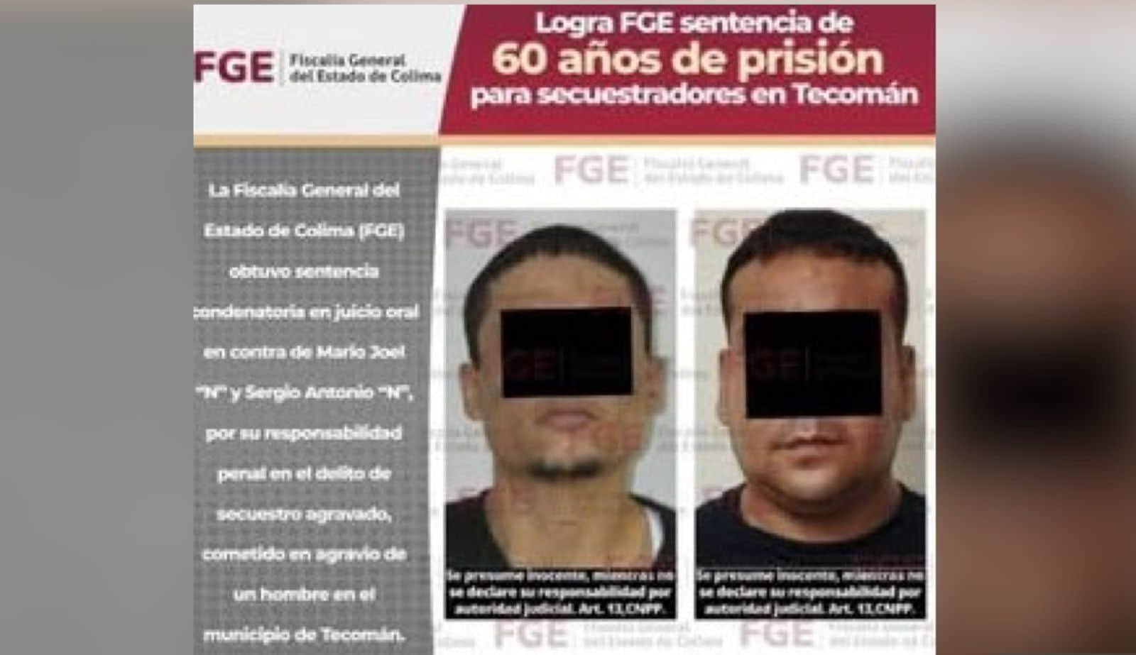 La pena máxima de 60 años fue impuesta a dos hombres encontrados culpables de secuestrar a una persona durante más de dos semanas en una clínica para tratamiento de adicciones en Tecomán. Este fallo judicial representa una sanción severa que refleja la gravedad del delito cometido y la protección a la víctima.